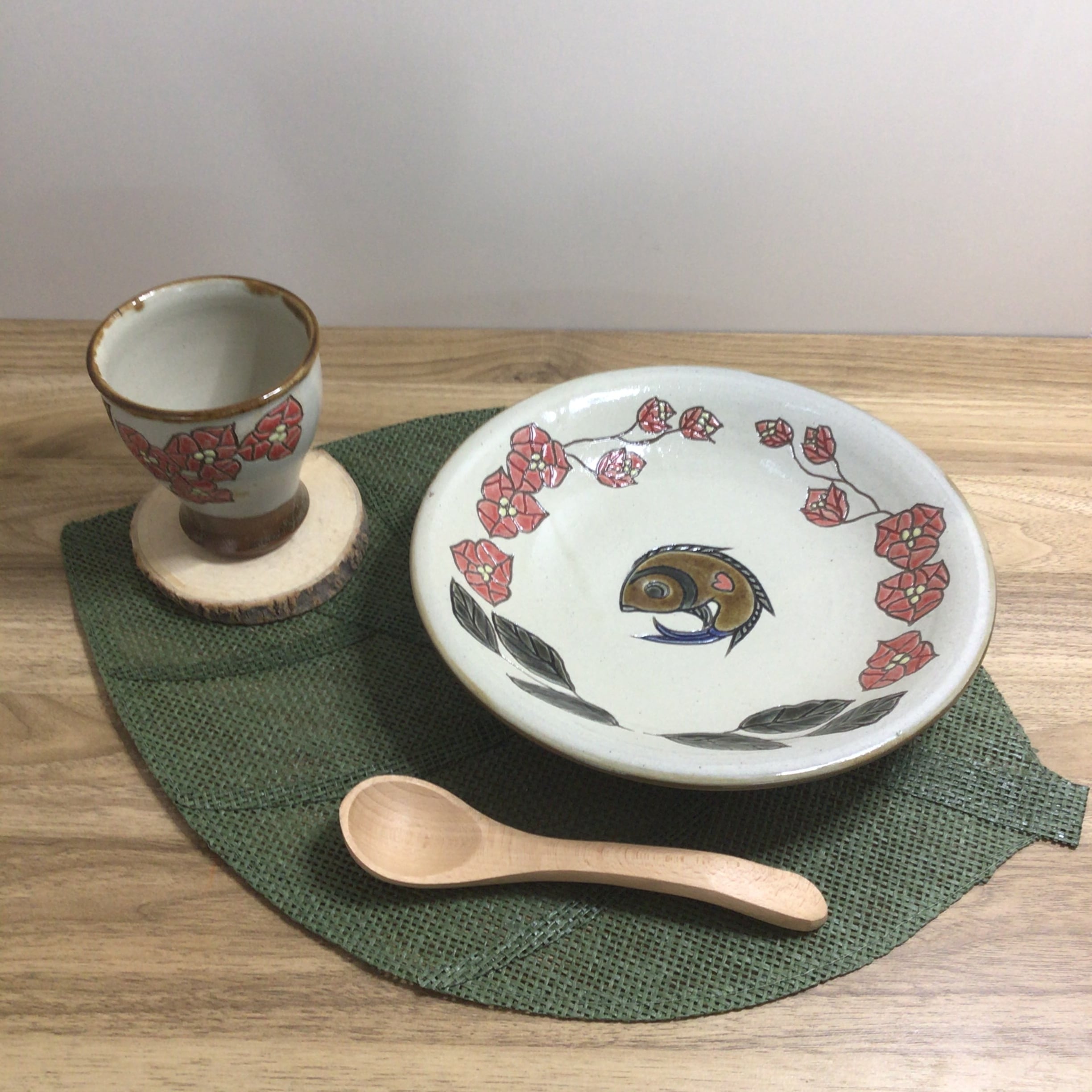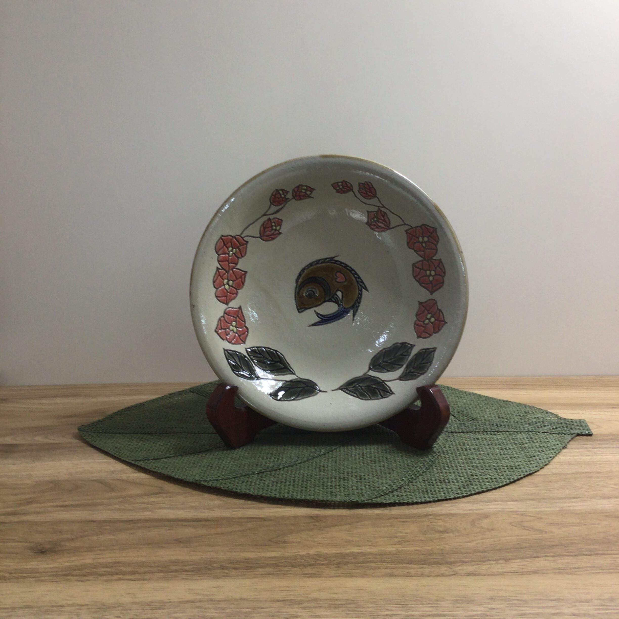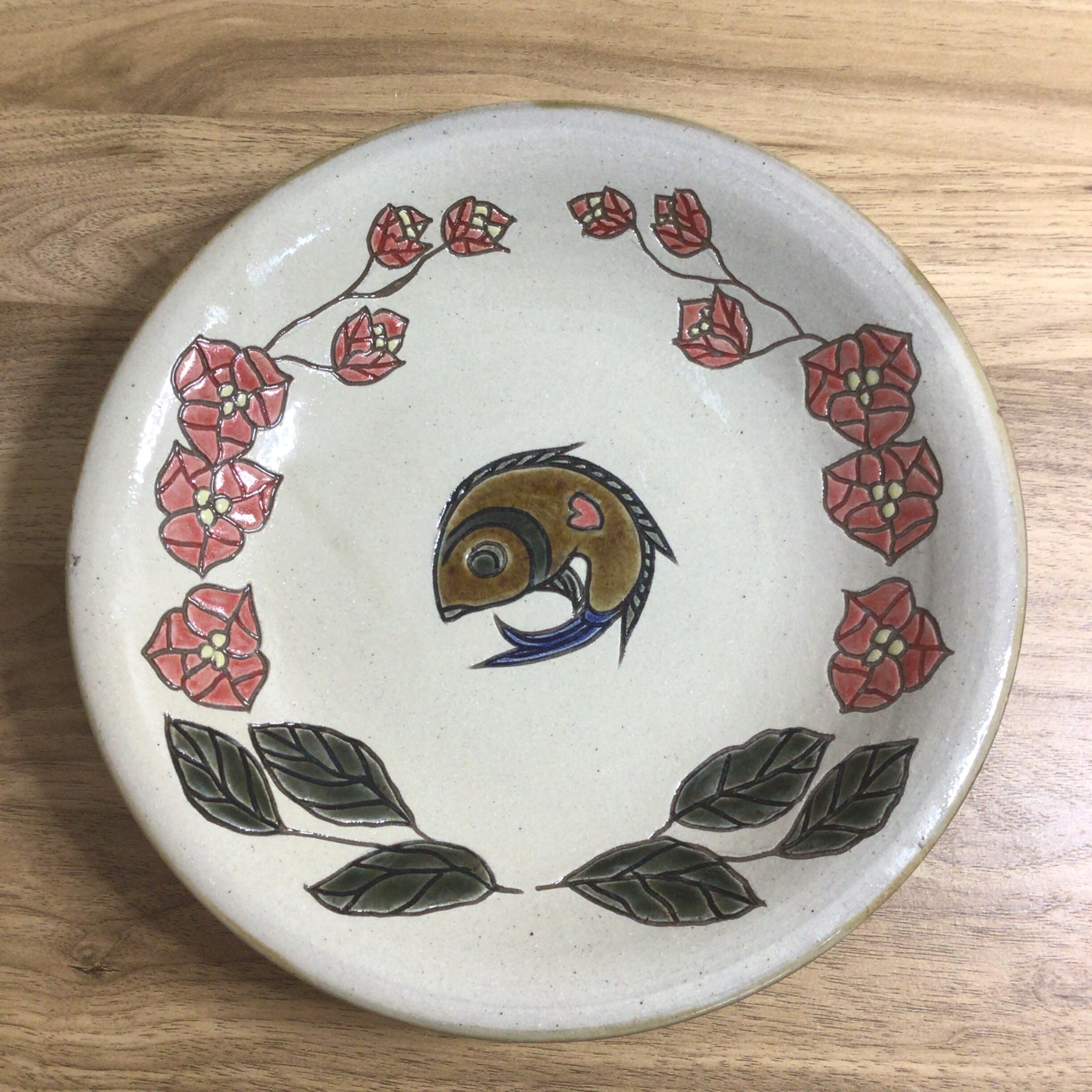 サイズ 直径 約21cm / 高さ約4cm ブーゲンビリアの花の冠の中に魚を描きました。 魚は子孫繁栄を意味するめでたい柄で、沖縄に伝わる定番の柄です。 お祝い事のプレゼントにもぴったりです。 お料理を華やかに盛れます。また、飾っても可愛いです。