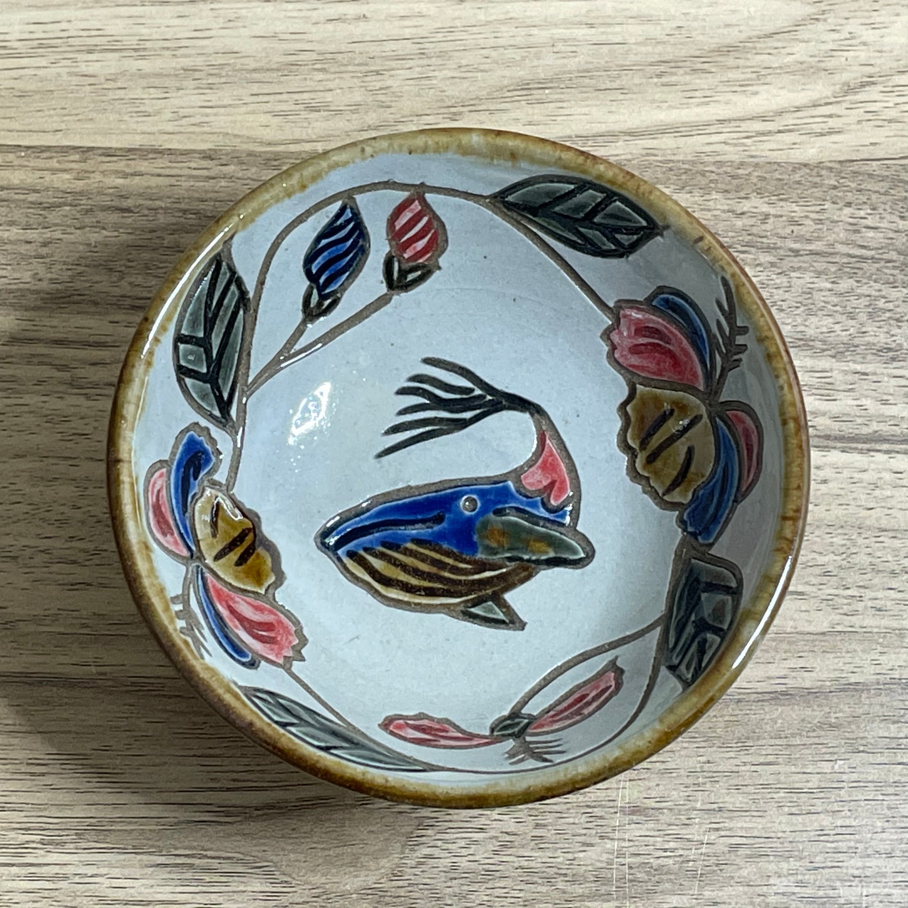サイズ 口径 約9.5cm / 高さ 約4.5cm 内側にハイビスカスとクジラを描きました。 デザートや漬物、和物などに最適です。 指輪やイヤリングを入れて、お洒落な使い方もできます。