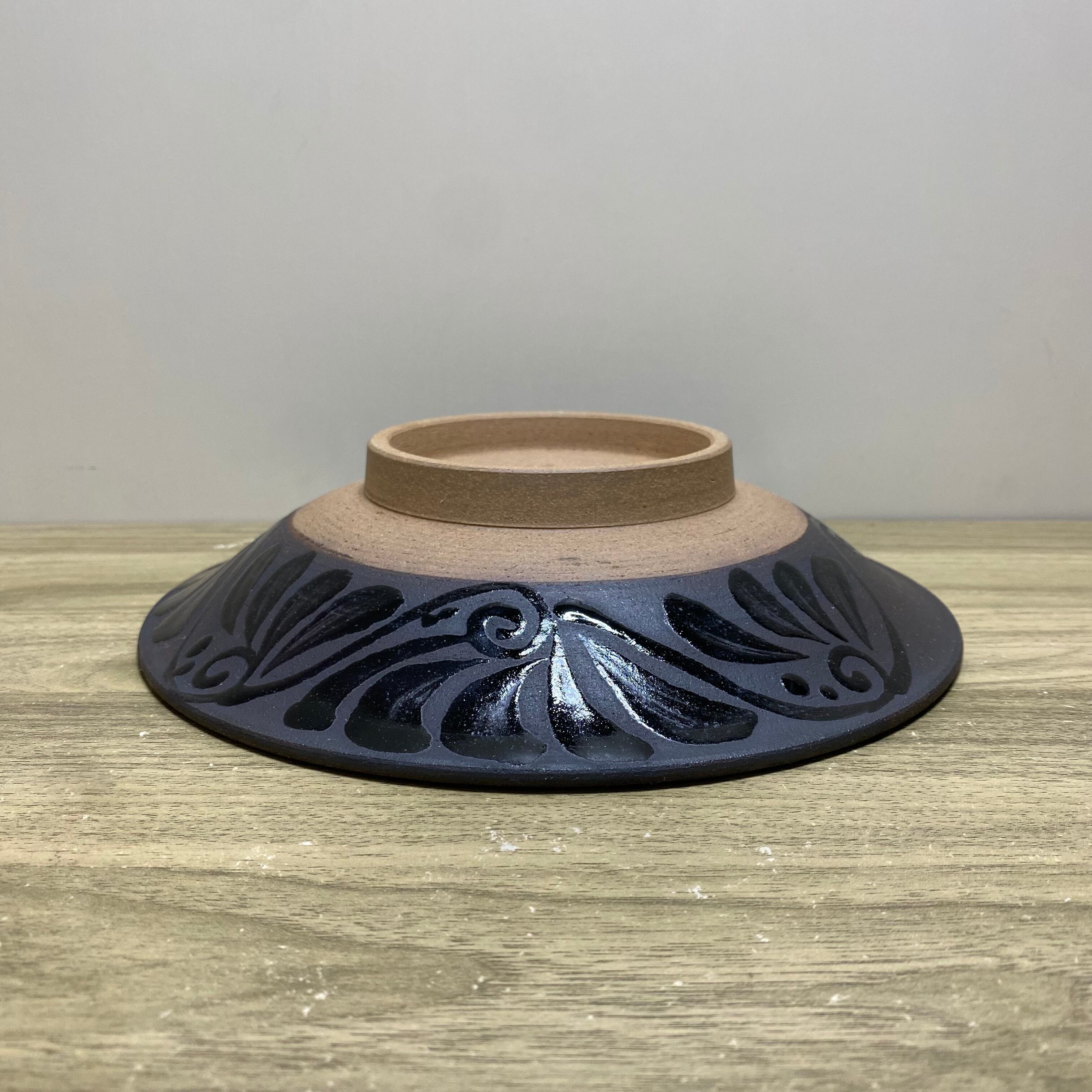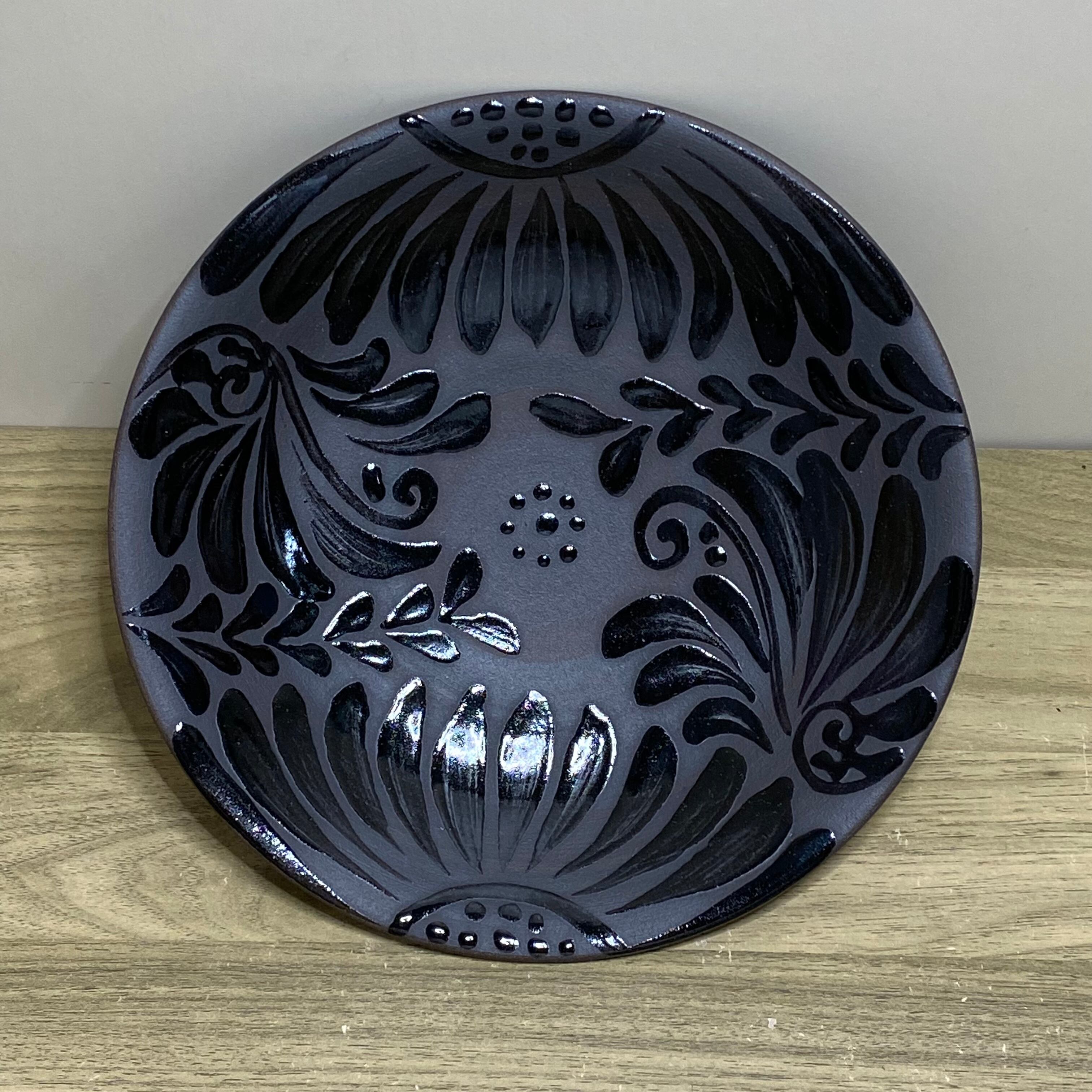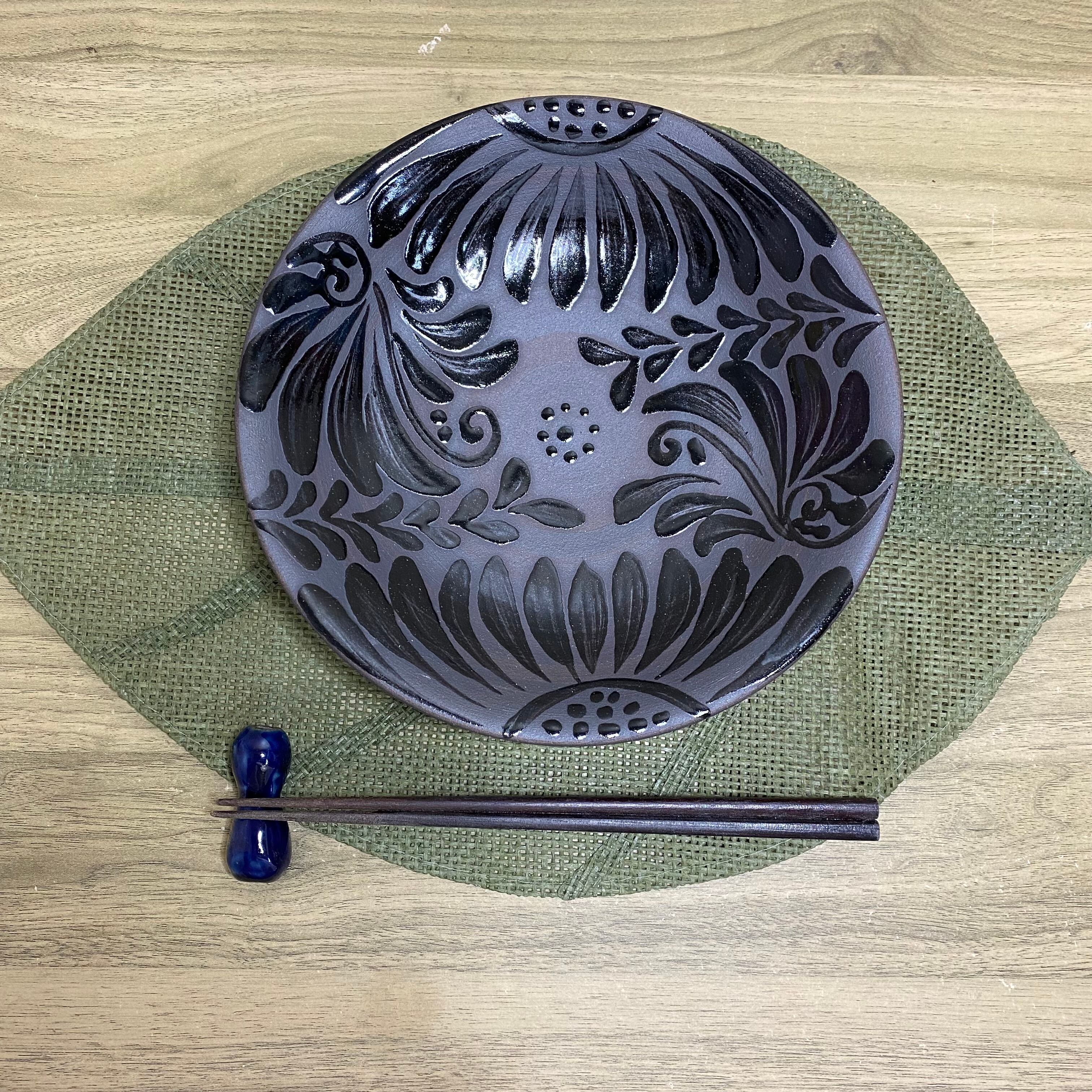 サイズ 直径 約21.5cm 高さ 約5cm 沖縄のやちむんで定番の唐草模様を、シックな黒で描いたお皿です。 勢いよく伸びる唐草は、長寿や子孫繁栄を表しているとされています。 カレーやパスタ、盛り皿としてお使い頂けます。